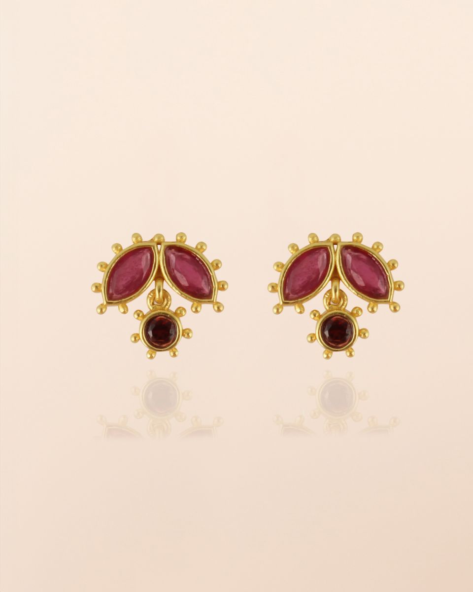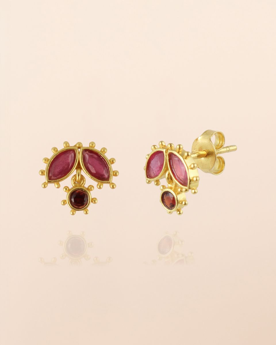 Earring with 2,5x5mm marquise ruby and 2,5mm round garnet with dots, gold plated