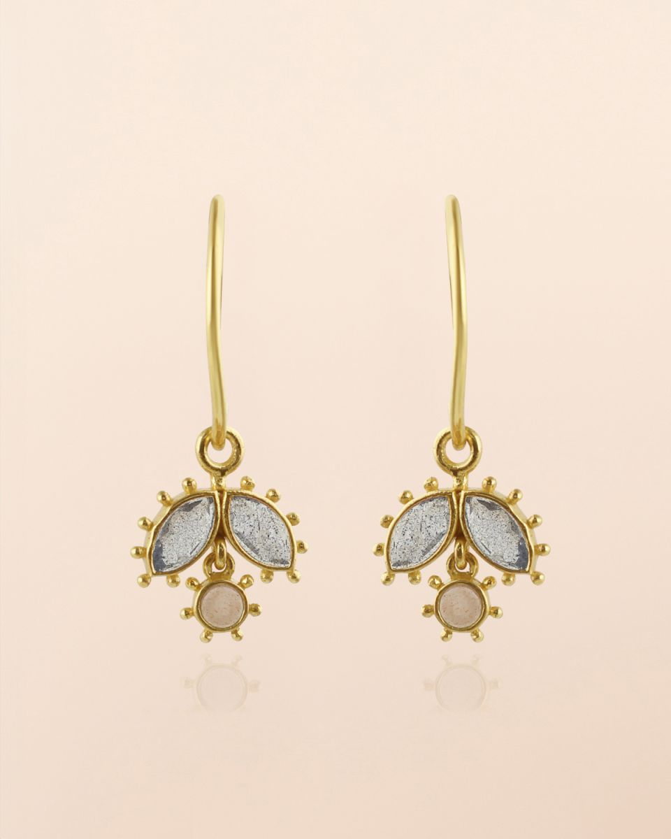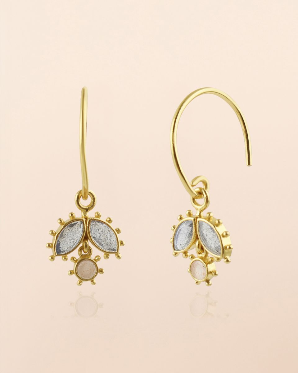 Earring with 2,5x5mm marquise labradorite and 2,5mm round peach moonstone with dots, gold plated