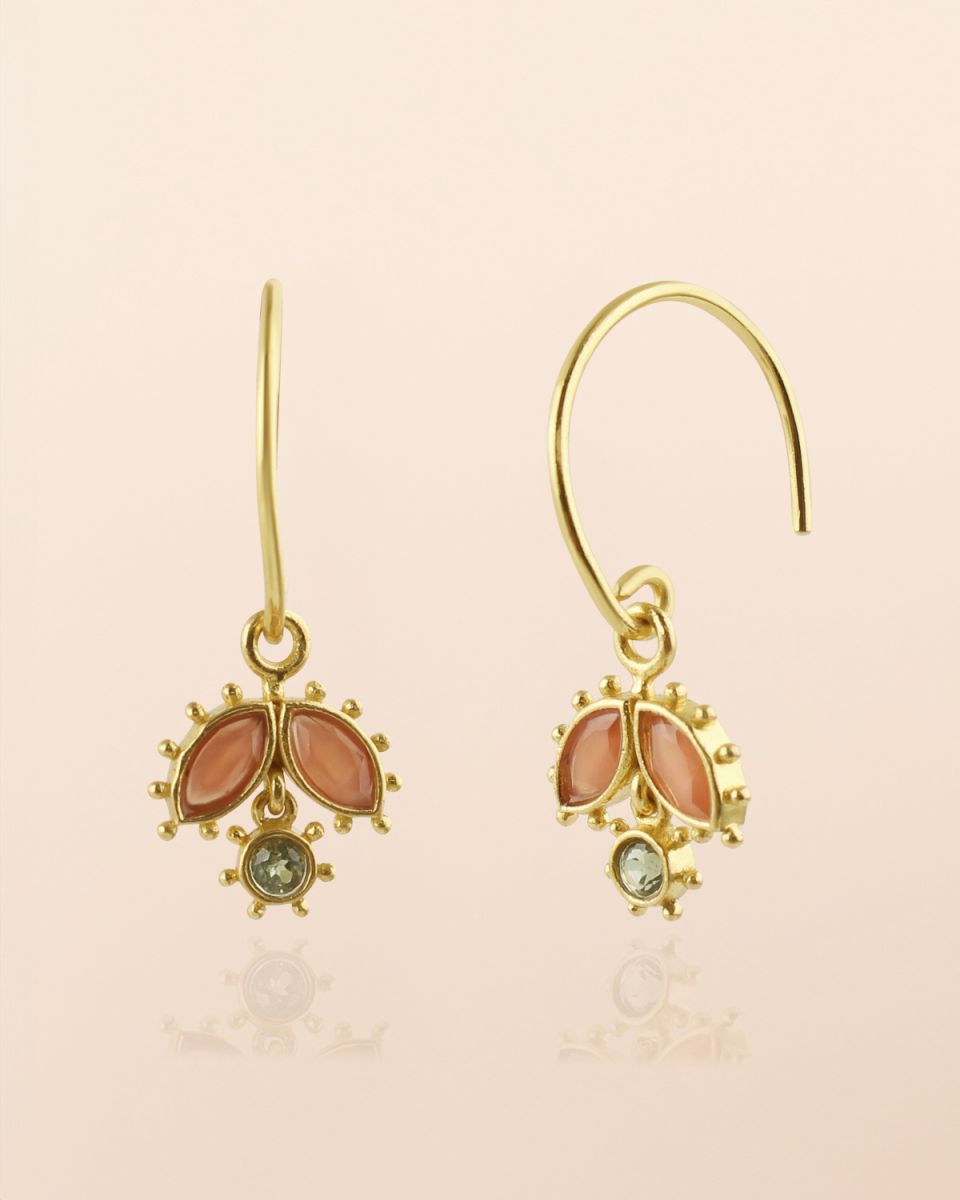Earring with 2,5x5mm marquise peach moonstone and 2,5mm round peridot with dots, gold plated