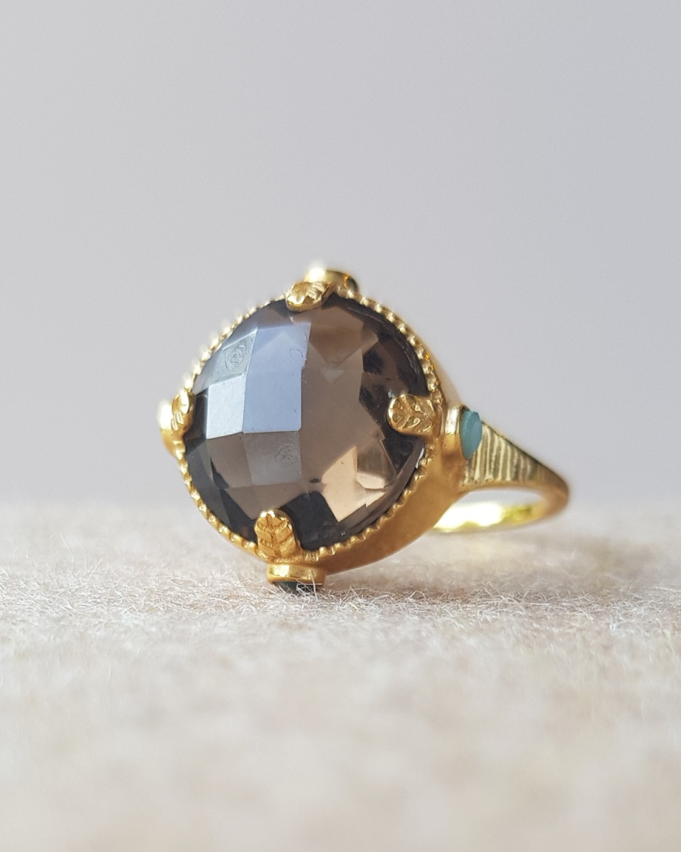 Ring with 12mm round smokey quartz and 2mm round amazonite, gold plated