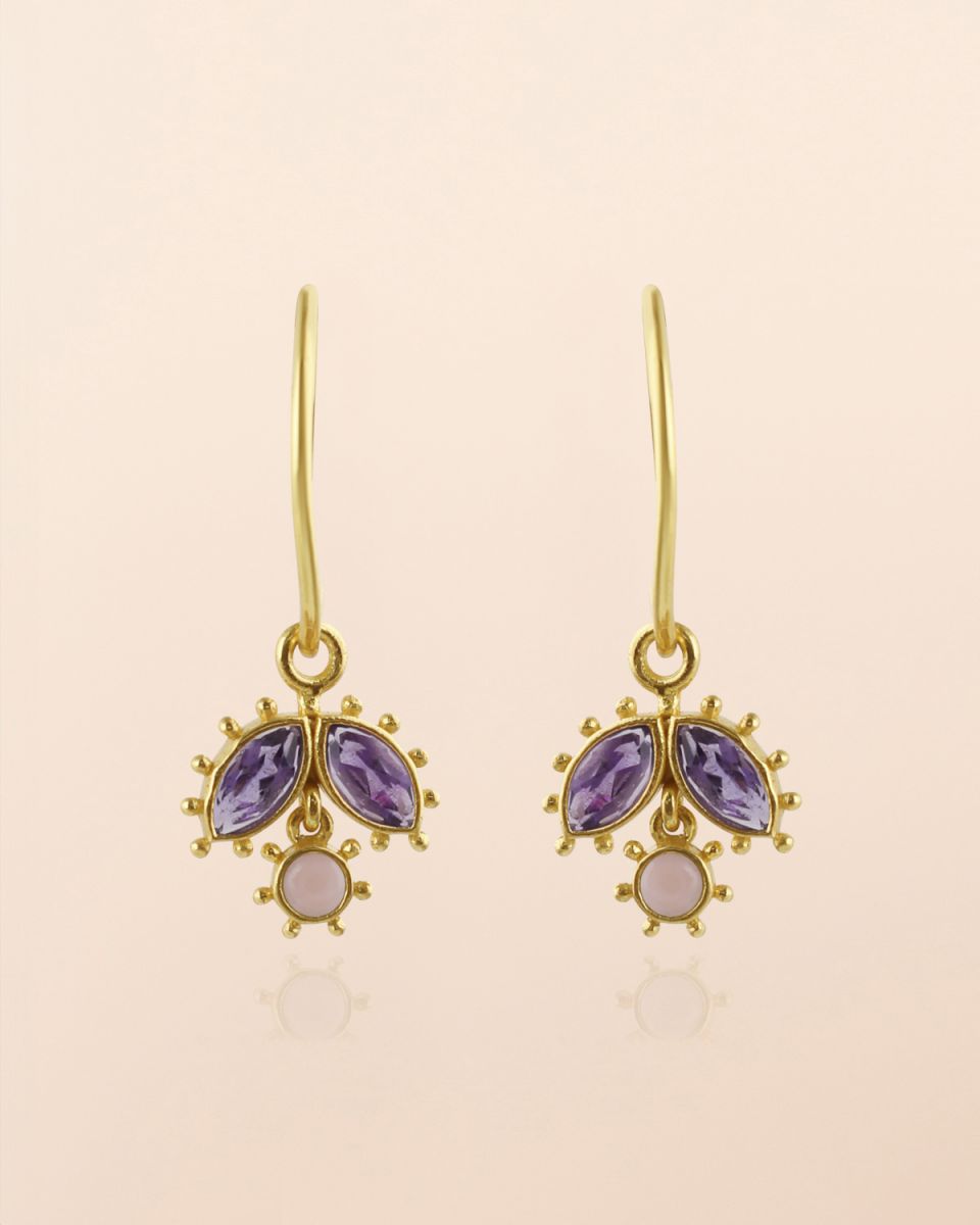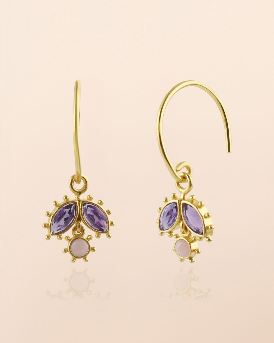 Earring with 2,5x5mm marquise amethyst and 2,5mm round pink opal with dots, gold plated