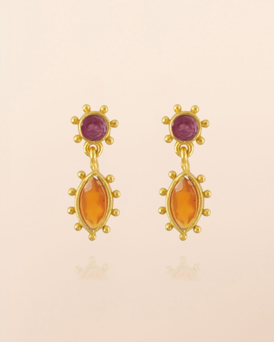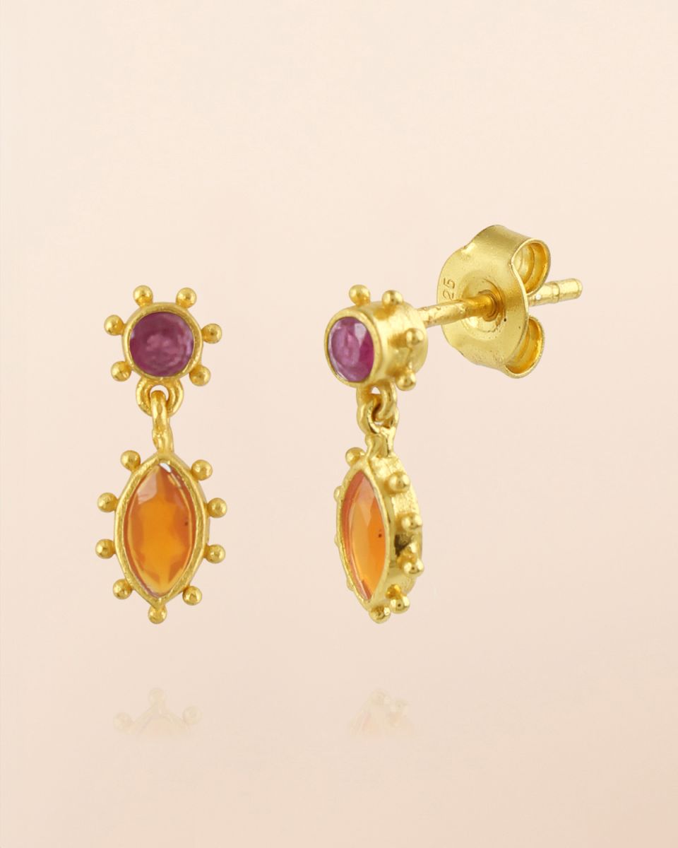 Earring with 2,5x5mm marquise red agate and 2,5mm round ruby with dots, gold plated