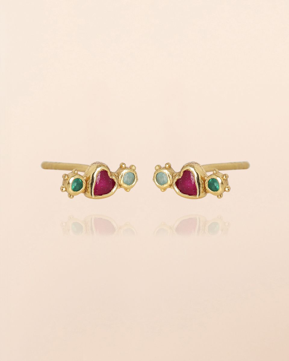 Earring with 3mm heart ruby and 1mm round amazonite and green agate with dots, gold plated